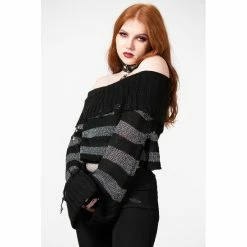 Doux pull vintage de Banned, parfait pour l’hiver et les saisons de transition. The Addicted Sweater est fait d’un mĂ©lange super doux de viscose et de nylon. Le pull a des manches mi-longues chics, avec de petits noeuds aux ourlets, et une encolure Sabrina Ă©lĂ©gante.