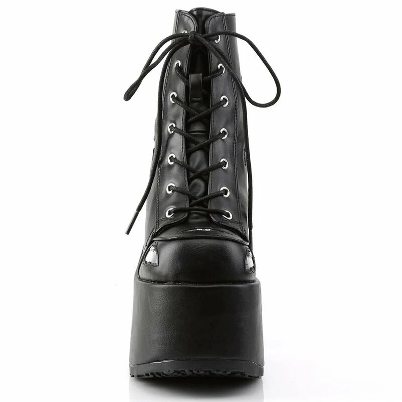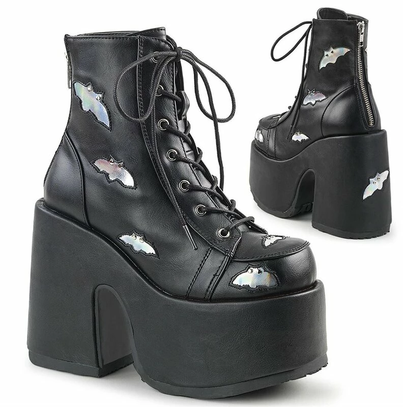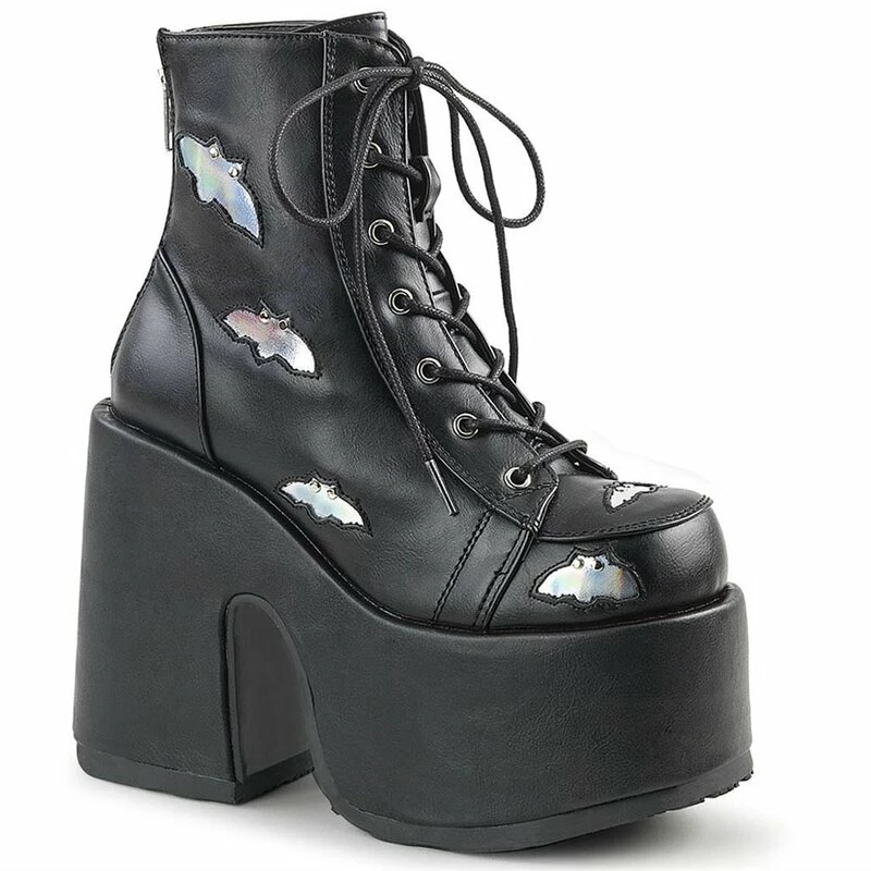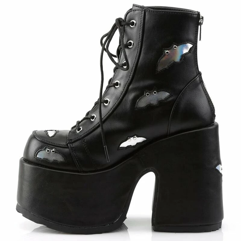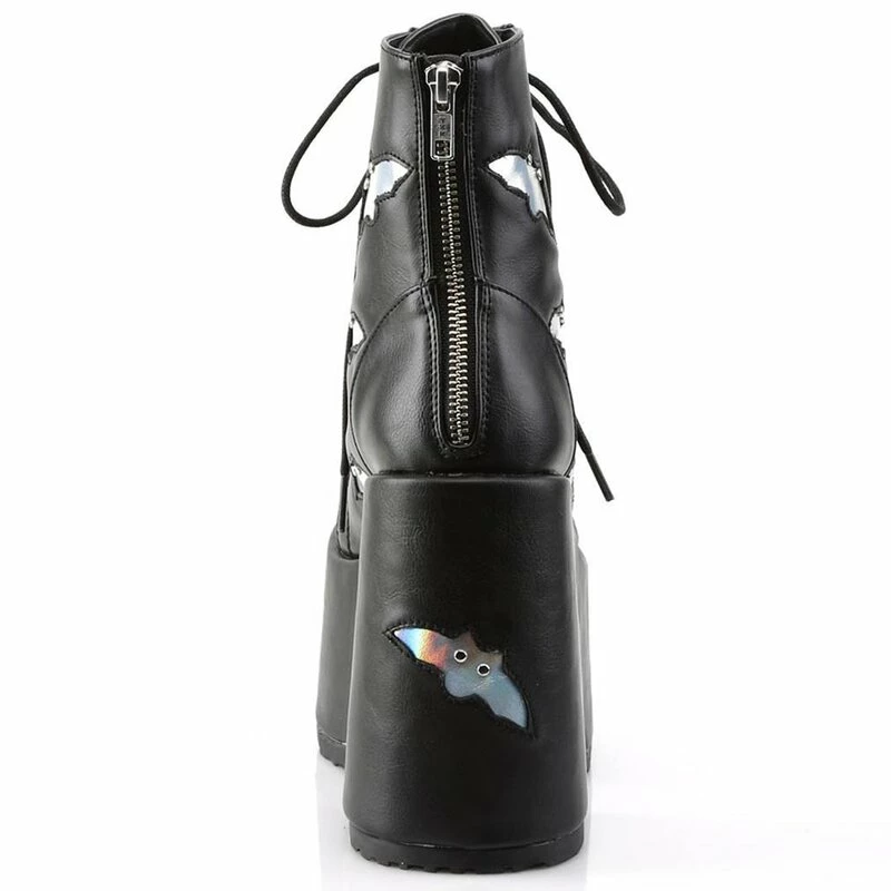 Bottines en cuir vegan cool de Demonia. Les Camel-201 sont des bottes à lacets avec une fermeture éclair au dos et une plateforme extra haute. Les bottes sont décorées de petites chauves-souris holographiques.