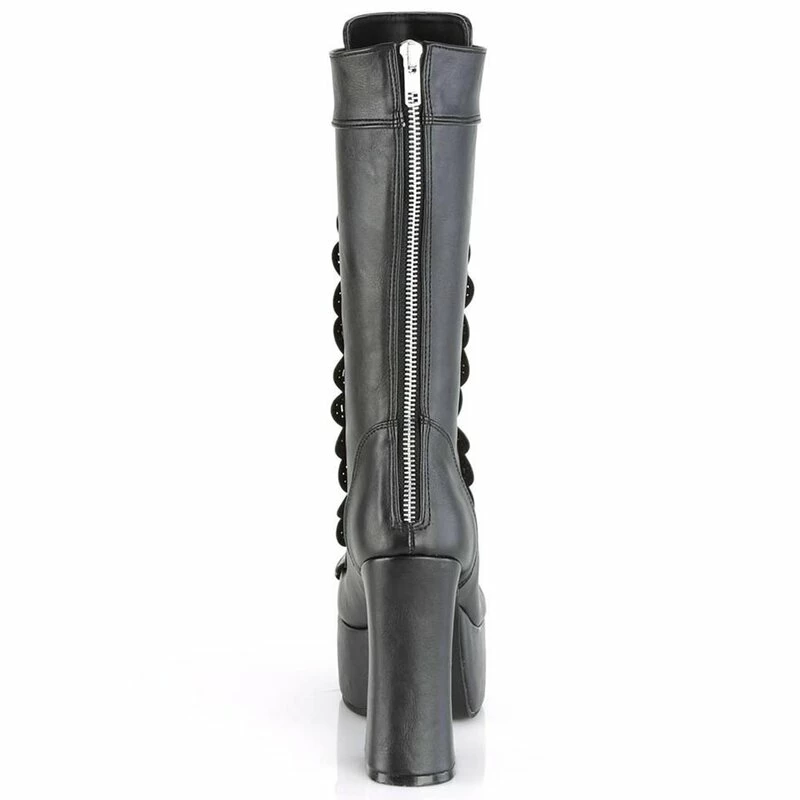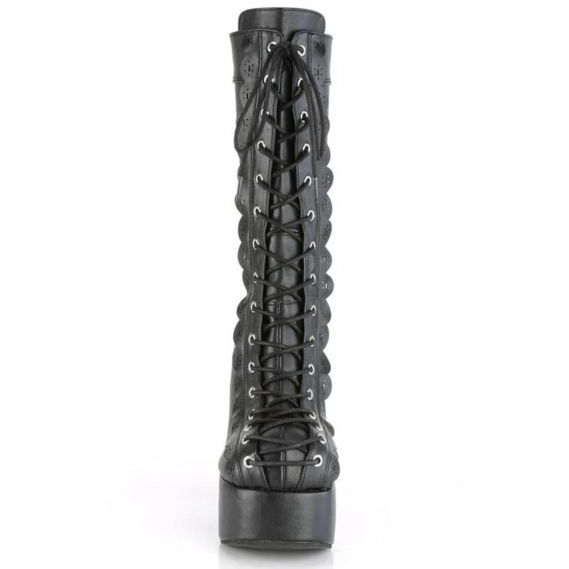 Bottes mi-mollet simples en cuir végétalien de Demonia. Les Charade-130 sont faites d’un cuir synthétique mat, avec une bordure perforée le long du laçage, qui court jusqu’au bout de la chaussure. Il y a une fermeture éclair à l’arrière pour une entrée facile.