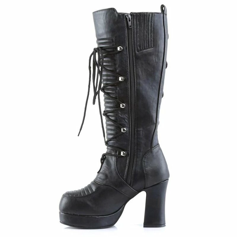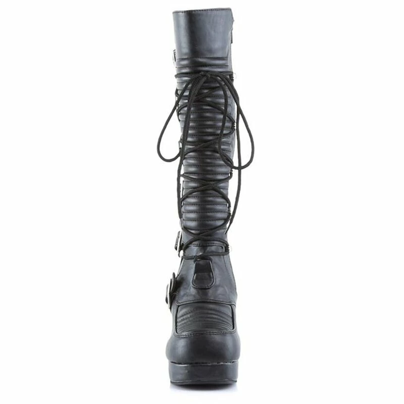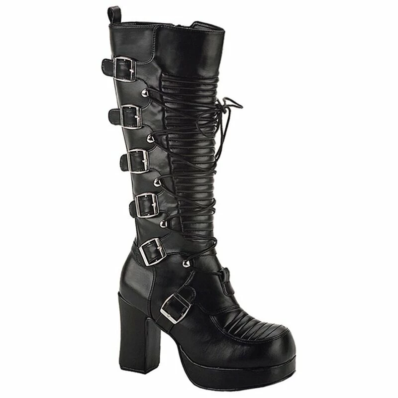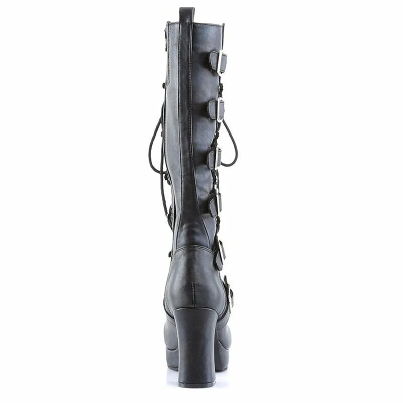 Bottes en cuir végétalien punk à hauteur de mollet Demonia. Les bottes Gothika ont un devant matelassé avec laçage. Il y a 6 boucles décoratives sur le côté. Une fermeture éclair et un insert élastique sont sur le côté opposé.