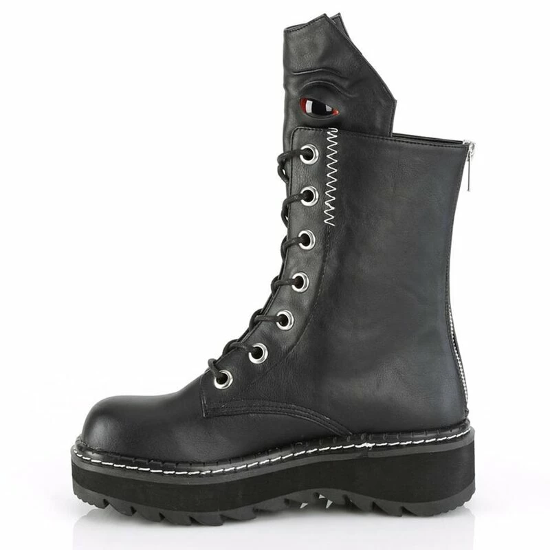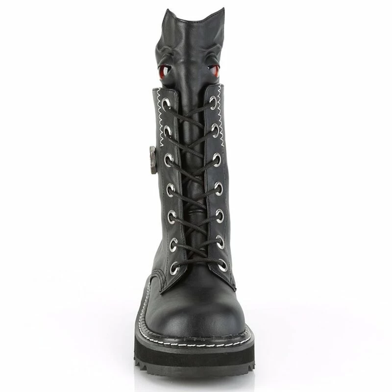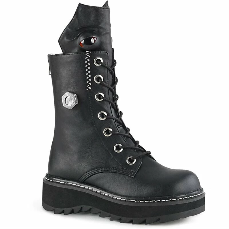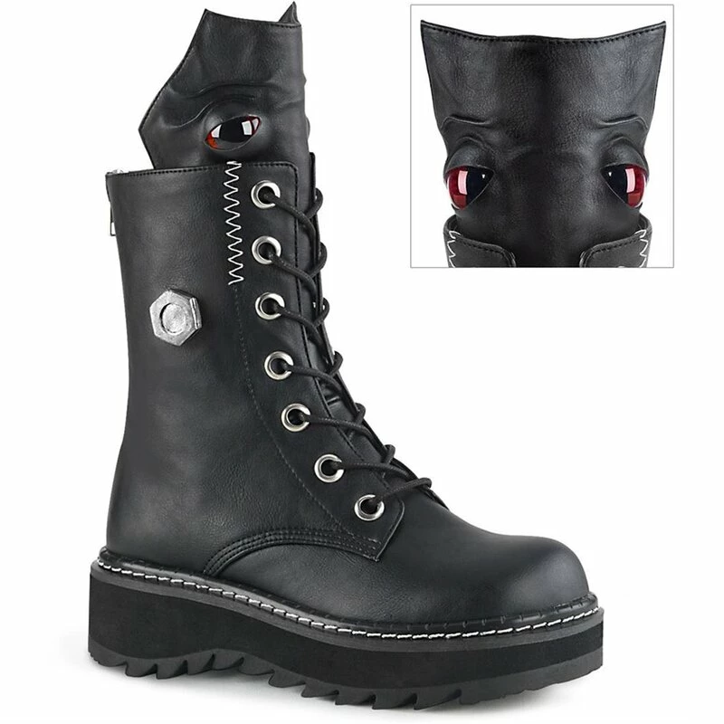 Bottes souterraines Demonia. Les Lilith-220 sont des bottes à lacets classiques en cuir végétalien avec une touche occulte. Deux yeux rouge sang dépassent de la langue en forme de cercueil. Il y a un boulon décoratif sur le côté. Il y a une fermeture éclair sur le côté opposé.