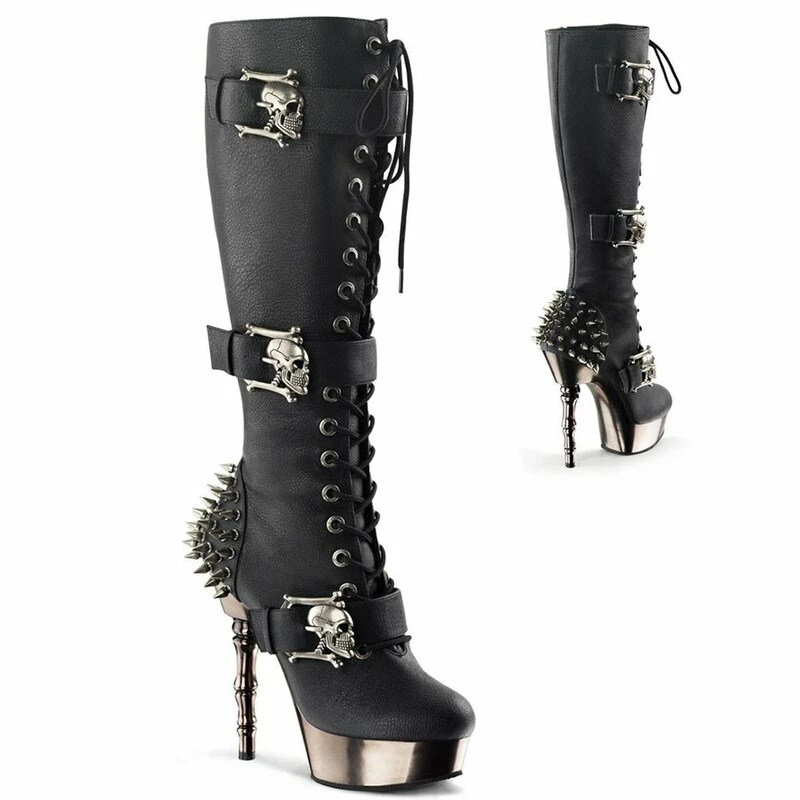 Bottes en cuir vegan punk de Demonia. Les bottes muerto ont trois boucles de ceinture en forme de crânes. Il y a des rivets à pointe sur le talon. L’Abastaz a la forme d’un os de doigt. Les bottes ont des lacets sur le devant, mais aussi des fermetures éclair latérales.