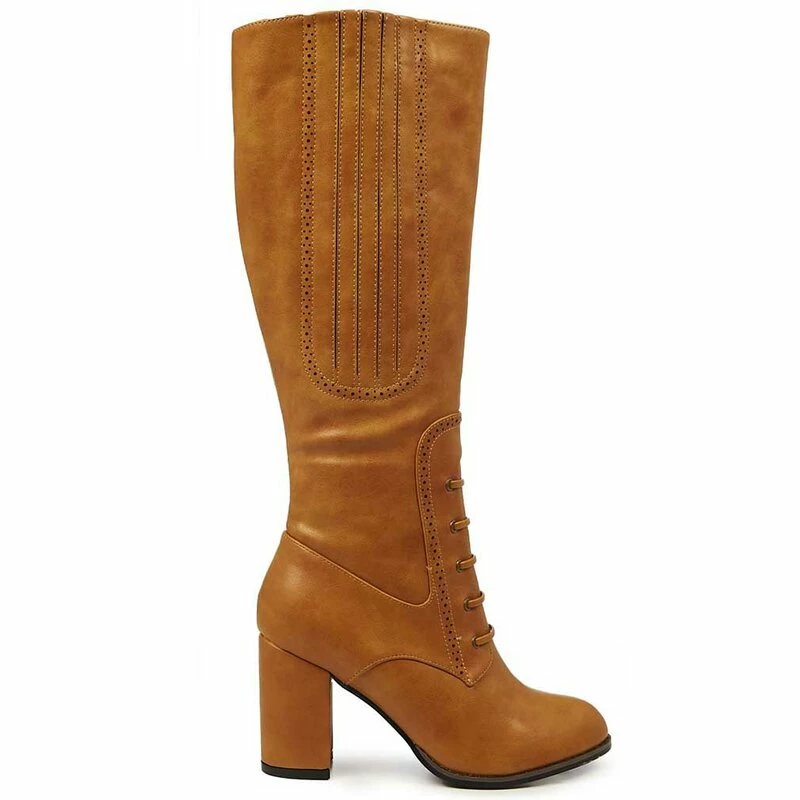 Bottes vintage simples en cuir synthétique de Banned Retro. La botte Roscose a une bordure décorative perforée avec un laçage décoratif. Il y a des inserts élastiques sur le côté pour un ajustement confortable et une liberté de mouvement. Une fermeture éclair extra longue sert de fermeture.