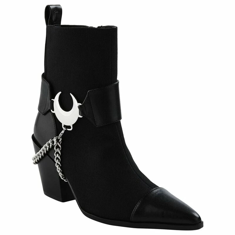 Je ne veux pas sortir dans le vert pour boire et griller, je veux me détendre dans une clairière au clair de lune. Les bottines Killstars Luna sont parfaites pour la sorcière moderne. Les chaussures sont en twill de toile avec renforts b en cuir vegan. Il y a un bracelet en similicuir avec un croissant de lune en métal sur la tige. Il y a deux chaînes métalliques qui peuvent être facilement retirées et fixées.