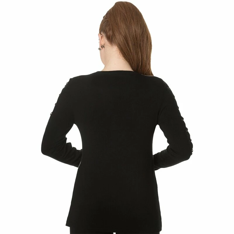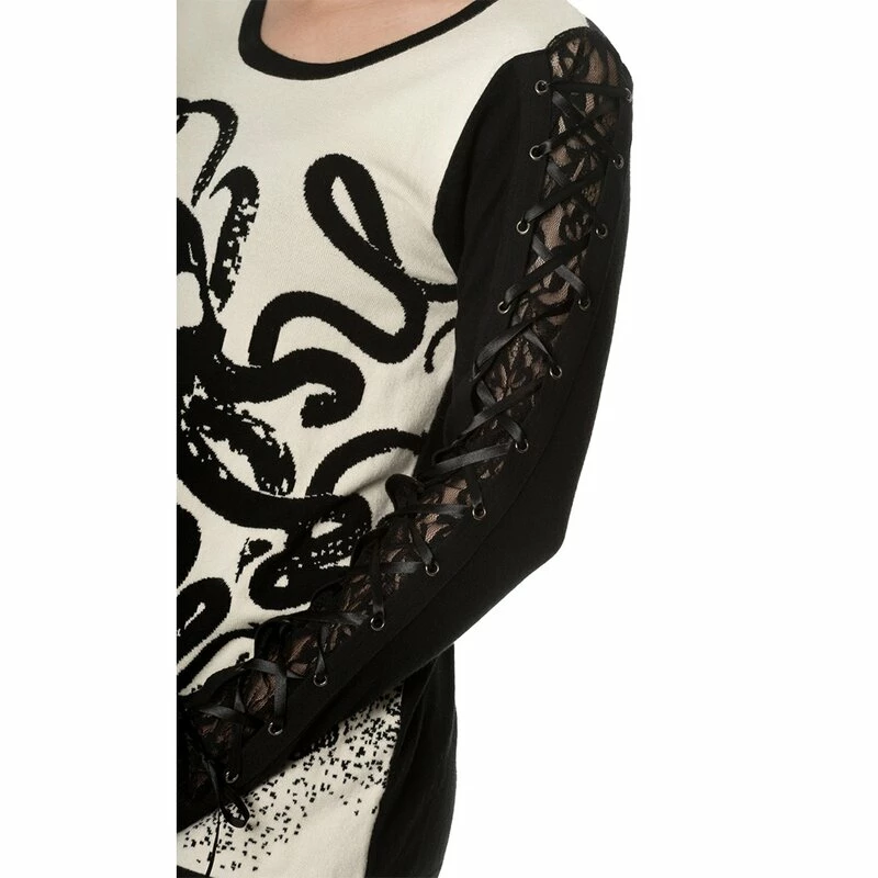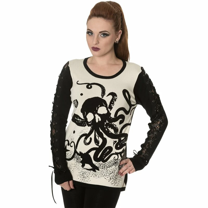 Pull douillet doux par Banned. Le pull Afterlife Begins avec sa matière épaisse et chaude est idéal pour les anniversaires froids. Sur le devant, une pieuvre en forme de crâne au fond de la mer. Les deux manches ont une bande centrale en dentelle transparente avec laçage.