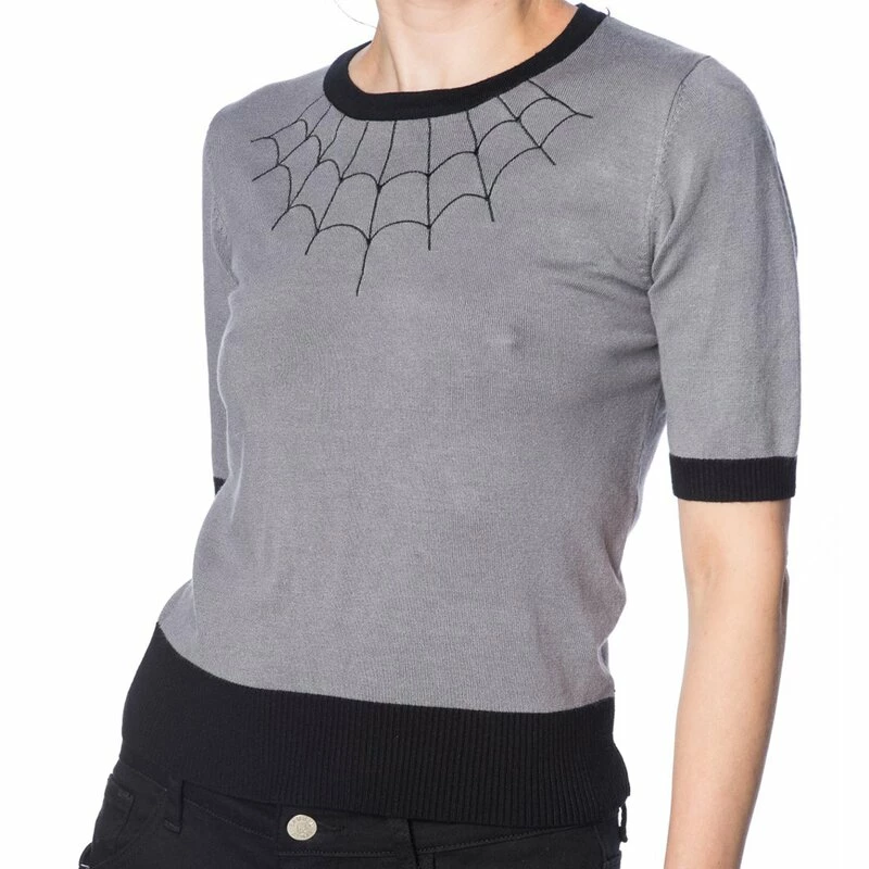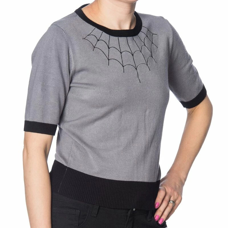 Pull en tricot foncé avec une touche d’horreur légère par Banned Alternative. Le pull Tarantula Web est gris avec un contraste noir et a une toile d’araignée brodée à l’avant et à l’arrière de l’encolure.