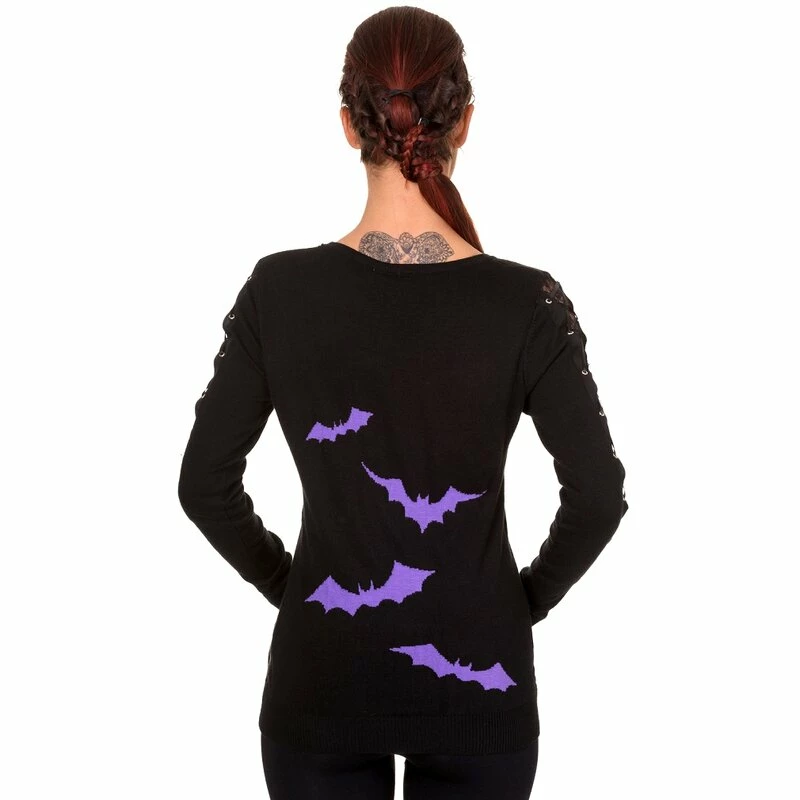 Pull doux de Banned. Le pull Friction Bats, avec son matériau épais et chaud, est idéal pour les saisons froides. Le noir simple est rafraîchi par le motif de la chauve-souris douce. Les deux manches ont une bande médiane de dentelle transparente avec laçage.