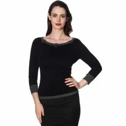 Pull vintage simple de Banned Retro. Le pull en maille Viveka est noir avec un contraste vert olive sur l’encolure, l’ourlet et les poignets. Des boutons décoratifs sont sur l’encolure.