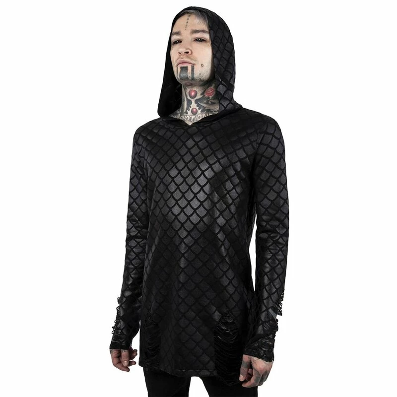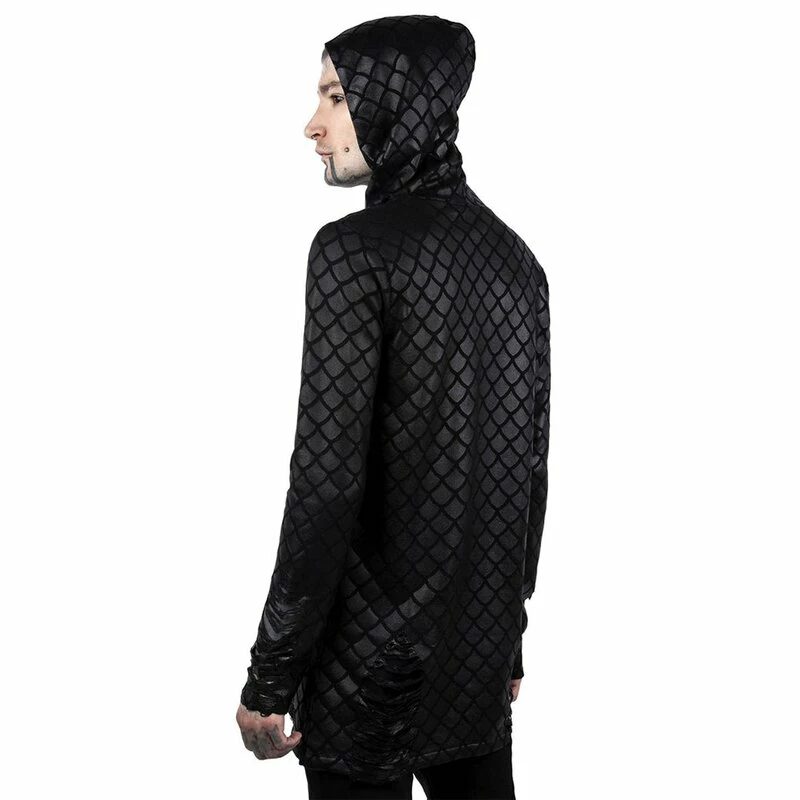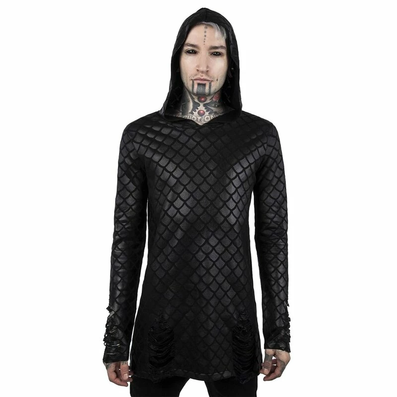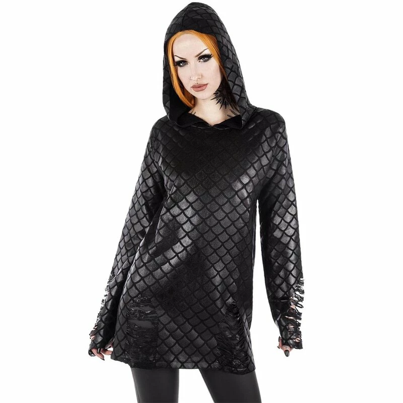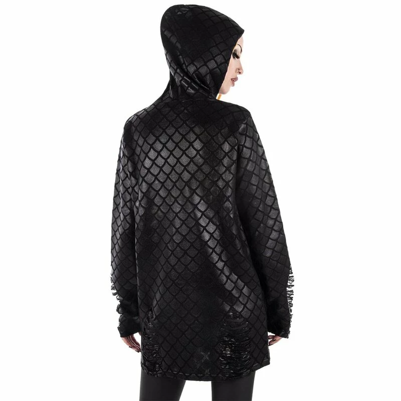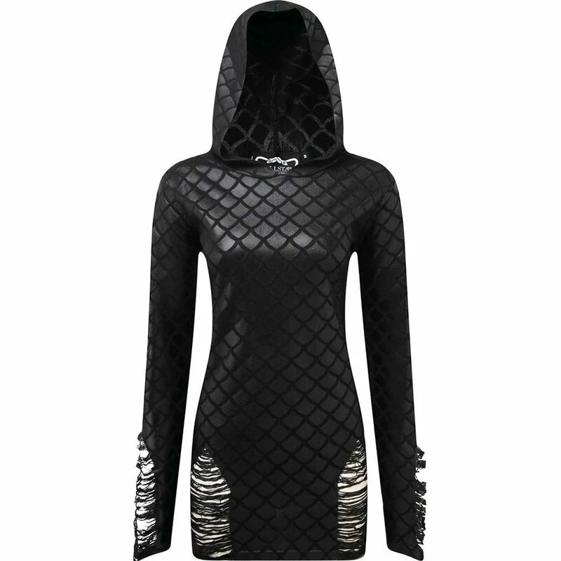 Vous aspirez toujours à l’obscurité mystérieuse des océans du monde. Des énigmes non résolues, des secrets sombres et des créatures mythiques magiques, tout ce que votre c?ur désire se cache dans l’océan profond. Le pull Killstars Odyssey Mer-Foiled vous rapproche de ce fantasme avec le motif à l’échelle d’une sirène brillante. Les manches et les hanches sont déchiquetées avec art.
