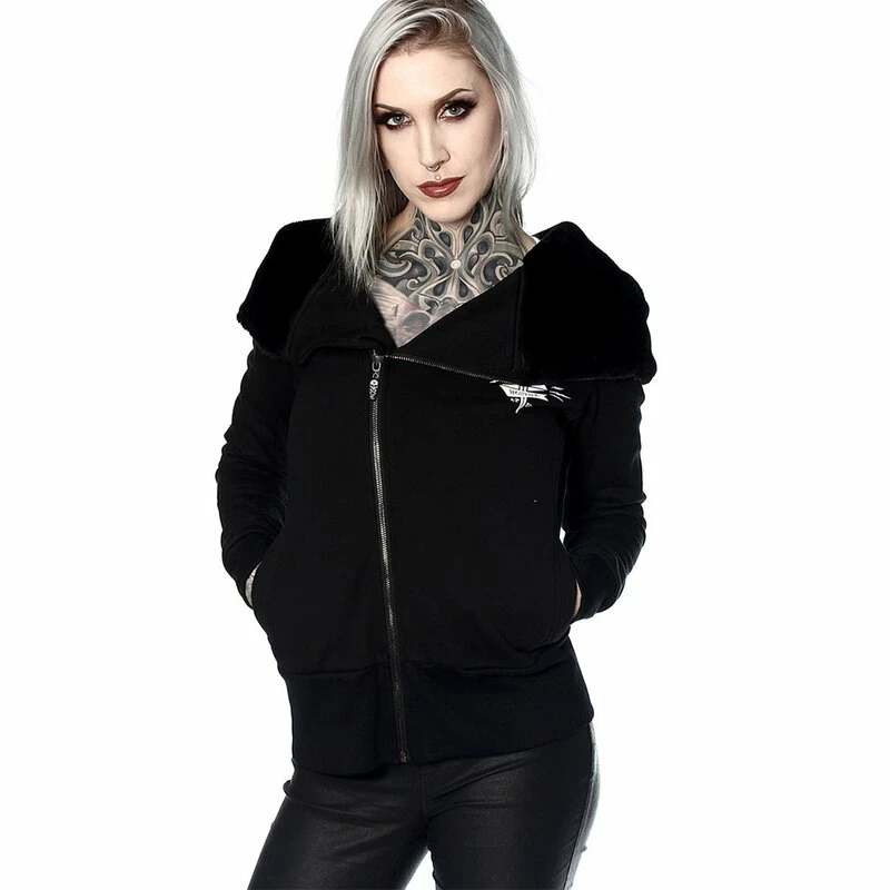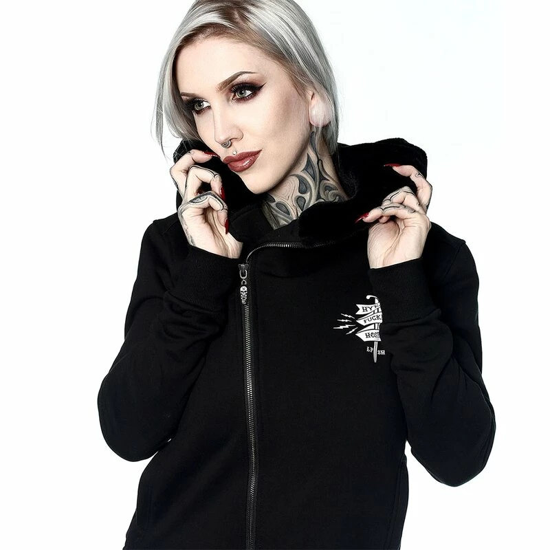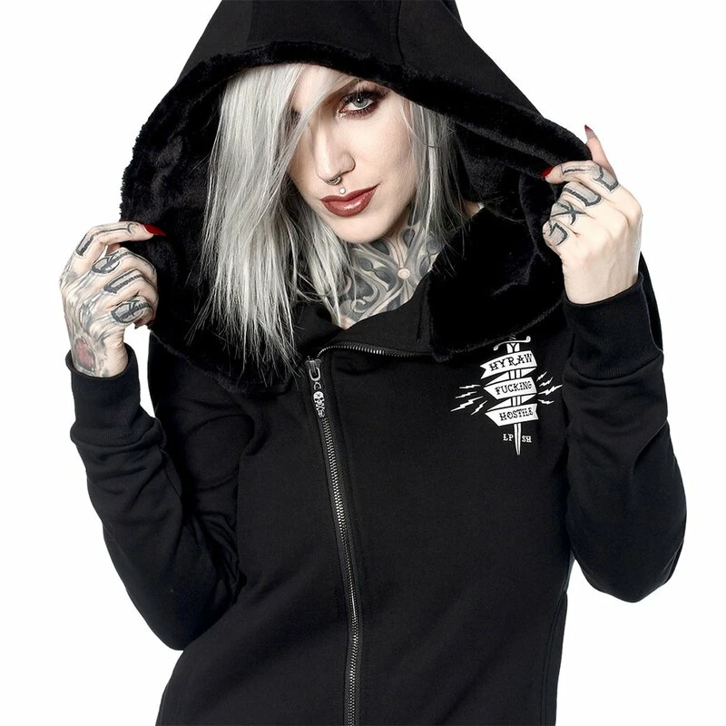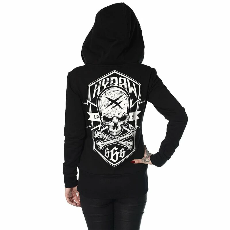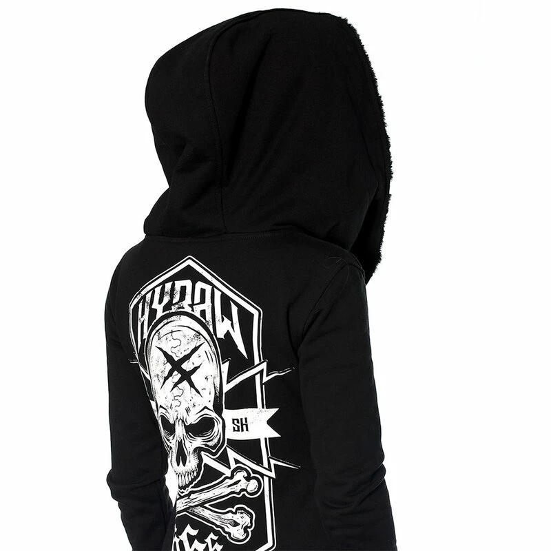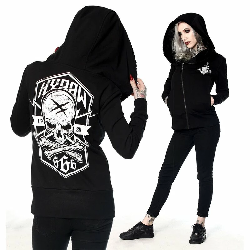 Le classique des vêtements confortables est définitivement un sweat à capuche, la couleur parfaite pour toujours reste toujours noire. Ensemble, ils forment un couple de rêve punk. Le sweat à capuche à badge Hyraw combine les deux, avec une impression effrayante d’un crâne, avec des os croisés et une bannière Hyraw au dos. Plus de détails incluent un petit logo d’épée sur la poitrine gauche et deux poches latérales avec fermetures à glissière. La capuche est doublée de fourrure synthétique douce.