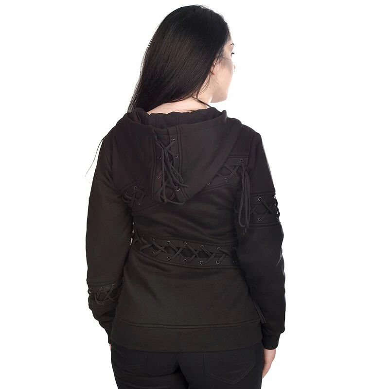 Veste à capuche très douce de Noir Pistol. La veste à capuche Eye est recouverte de plusieurs lacets décoratifs, un sur la capuche, un sur chaque bras et deux autour du haut du corps. La veste a deux poches sur le côté.